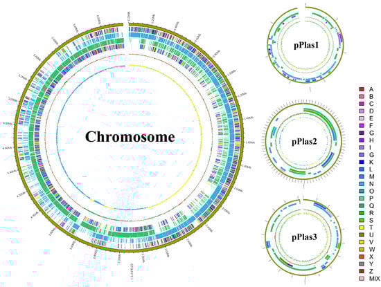 Graphical circular maps of the Paenibacillus peoriae ZF390 chromosome and plasmids pPlas1, pPlas2, and pPlas3 generated with CGview Server. From outside to center, rings 2 and 5 show protein-coding genes oriented in the forward (colored by COG categories) and reverse (colored by COG categories) directions, respectively. Rings 3 and 4 show genes on the forward and reverse strands. Ring 6 shows the GC content plot, and the innermost ring shows the GC skews, where yellow indicates positive values, and blue indicates negative values.