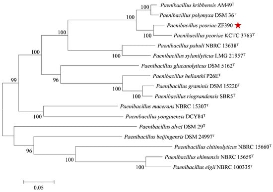 Phylogenetic tree highlighting the relative position of P. peoriae ZF390 among other Paenibacillus species. The phylogenetic tree was constructed based on eight housekeeping genes (gyrB, rpoD, rplA, atpD, holB, rho, dnaA and rpsA) according to the aligned gene sequences using the maximum likelihoods method in MEGA 7.0 software. Bootstrap values (1000 replicates) are shown at the branch points. The scale bar indicates 0.05 nucleotide substitution per nucleotide position. GenBank accession numbers associated with the housekeeping loci for all strains are presented in Supplementary Table S5. The red star marks the location of strain ZF390.