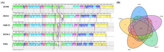 Whole genome sequences of these five Paenibacillus strains were also compared to identify specific genes in P. peoriae ZF390 (Figure 6B). As shown in Figure 6B, there were 3372 core genes present in ZF390 that were shared with strains HS311, SQR-21, HY96-2, and PS04. It was speculated that these orthologous protein-coding genes were relatively conserved in Paenibacillus. Additionally, 4122 orthologous genes were shared between ZF390 and HS311, while ZF390 shared 3912 and 3889 orthologous genes with SQR-21 and HY96-2, respectively. Moreover, strain ZF390 shared merely 3652 orthologous genes with PS04, whereas it indicated a higher level of similarity with strain HS311. Furthermore, only two and three unique genes were identified in the genomes of strains ZF390 and PS04, which revealed close relationships among the five selected strains.