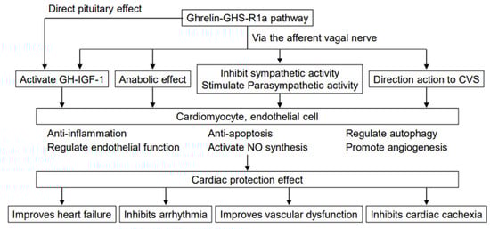 Effect of ghrelin-GHS-R1a pathway on the cardiovascular system. Ghrelin affects the cardiovascular system in many different ways, including inhibiting sympathetic activity, activating parasympathetic activity, improving energy balance, and facilitating mechanisms mediated by GH and IGF-1, thereby improving cardiac function in heart failure. Some of the effects may include direct actions on the cardiovascular system. CVS, cardiovascular system.
