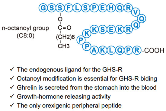 Human ghrelin is composed of 28-amino acid residues in which n-octanoic acid (C8:0), a medium-chain fatty acid, is esterified to the side chain of the third serine residue (Figure 2) [1]. In humans, multiple ghrelin-derived molecules with different numbers of fatty acids are generated by post-translational processing [2]. This fatty acid modification is critical for the GHS-R-mediated physiological effects of ghrelin, and is catalyzed by ghrelin o-acyltransferase (GOAT) [3]. Ghrelin is found in a wide range of living organisms, including lower animals such as cartilaginous fish, and in many species, it is produced mainly in the stomach [4]. Gastric ghrelin-producing cells are closed-type cells that do not reach the lumen; they were originally referred to as endocrine A-like cells in the gastric corpus mucosa layer and had unknown functions [5,6]. In the rat stomach, ghrelin gene expression is very low at birth, starts to increase at around 1 week of age, and reaches almost adult levels at 5 weeks of age, prior to puberty [7]. Low levels of ghrelin gene expression are also observed in the small intestine, pancreas, hypothalamus, and other organs. In the gastric tissues and blood, the level of des-acyl ghrelin, the molecular form without fatty acid modification, is higher than that of acyl ghrelin [8]. It is presumed that des-acyl ghrelin is derived from unmodified fatty acids in the stomach tissues or is formed when fatty acids are cleaved from acyl-ghrelin in the blood [9].