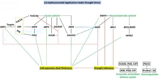 4.3. EBR Co-Ordinated Leaf Thickness and Conferred Drought Tolerance via Auxin and Brassinosteroids Signaling Pathways