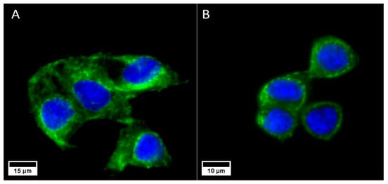 Caco2 cells expressing the EpCam (A) and SKBR3 cells expressing the TfR (B) receptors. In both cases, the nuclei are marked in blue (DAPI) and the cell membrane receptors are marked in green (Alexa Fluor® 488, Abcam).