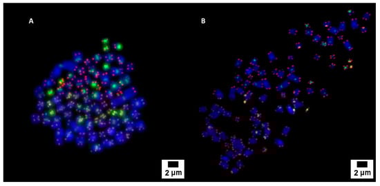 Pancentromeric–pantelomeric fluorescence in situ hybridization-stained metaphases of Caco2 (A) and SKBR3 (B) cells. Green signals correspond to centromeres, labeled with FITC; and red signals to telomeres, labeled with Cy3.