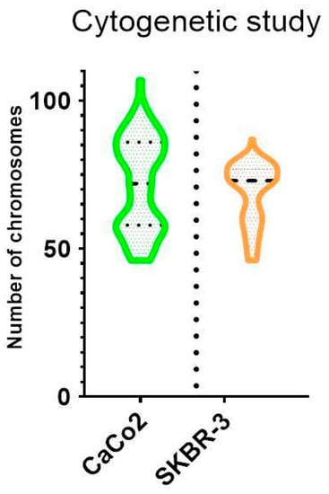 The cytogenetic analysis by pancentromeric and pantelomeric fluorescence in situ hybridization (Figure 2) was carried out to know the modal karyotype of each cell line and if they show structural chromosome instability that could influence the further results with the foci analysis. The analyses were performed on 100 cells of each of the cell lines. Caco2 cells showed two modal karyotypes of 58 and 86 chromosomes whilst SKBR3 showed a modal karyotype of 76 chromosomes (Figure 3). Only one Caco2 cell showed a dicentric chromosome plus an acentric fragment, all the other chromosomes in all analyzed cells showed one centromere and two telomere signals. In the case of SKBR3, all the cells showed a stable dicentric chromosome, which is consistent with the data provided by the manufacturer. No cell showed another structural chromosome aberration detected by pancentromeric and pantelomeric labeling.