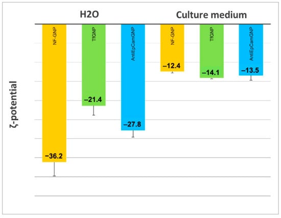 In Figure 4 are shown the ζ-potentials of non-functionalized (NF-GNP) and functionalized GNPs (TfGNP and AntiEpCamGNP), measured in water and in culture media. As can be seen, in water NF-GNPs showed the most electronegative ζ-potential, a difference that disappeared in the culture medium where the ζ-potentials were less electronegative than in water.