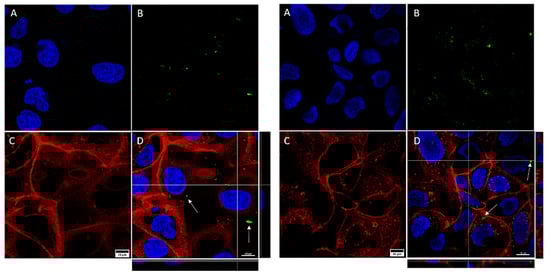 Confocal microscopy captures of Caco2 cells. The images show cells treated with NF-GNPs (left) and cells treated with anti-EpCam-functionalized GNPs (right). Nuclei (A) are marked blue (Hoechst 33342), plasma membranes (C) are marked red (CellMask™ Deep Red). Nanoparticles (B) are visualized as green dots due to their reflection being artificially assigned a green color by the microscope’s software. Merged images (D), and their orthogonal projections of the z-stack reconstructions (right and bottom), where GNPs (white arrows) can be seen.