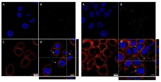 Confocal microscopy captures of SKBR3 cells. The images show cells treated with NF-GNPs (left) and cells treated with Tf-functionalized GNPs (right). Nuclei (A) are marked blue (Hoechst 33342), cytoplasmatic membranes (C) are marked red (CellMask™ Deep Red). Nanoparticles (B) are visualized as green dots due to their reflection being artificially assigned a green color by the microscope’s software. Merged images (D), and their orthogonal projections of the z-stack reconstructions (right and bottom), where GNPs (white arrows) can be seen.