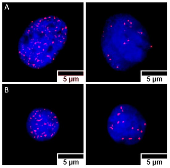 Nuclei from Caco2 (A) and SKBR3 (B) cells, stained with DAPI (blue), containing γ-H2AX foci immunostained with cyanine 3 (Cy3, red). For both cell lines, nuclei with high (left) and low (right) foci counts are shown. The images correspond to samples prepared 30 min (high foci count) and 4 h (low foci count) after irradiation, treated with anti-EpCam-functionalized GNPs (Caco2) or transferrin-functionalized GNPs (SKBR3).