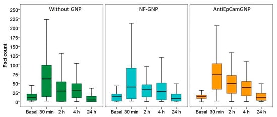 Box plots of the number of foci per cell in Caco2 cells before (basal) and at different times (30 min, 2, 4 and 24 h) after irradiation, in the absence of GNPs (Without GNP) or in the presence of non-functionalized GNPs (NF-GNP) or anti-EpCam-functionalized GNPs (AntiEpCamGNP). Horizontal lines inside boxes indicate the median.