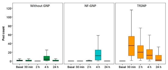 Box plots of the number of foci per cell in SKBR3 cells before (basal) and at different times (30 min, 2, 4 and 24 h) after irradiation, in the absence of GNPs (Without GNP) or in the presence of non-functionalized GNPs (NF-GNP) or transferrin-functionalized GNPs (TfGNP). Horizontal lines inside boxes indicate the median.