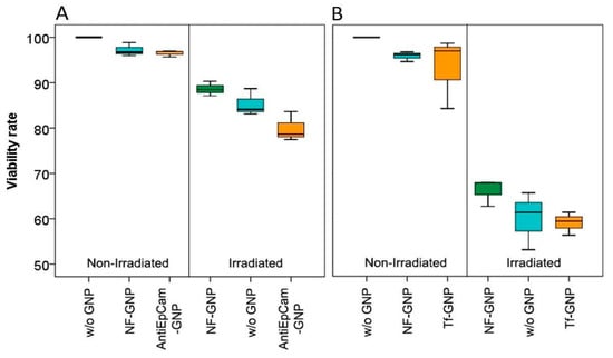 Viability rates of Caco2 (A) and SKBR3 (B) cells, left, non-irradiated and right, 24 h after irradiation. From left to right, the boxes mark the viability of cells in the absence of GNPs (w/o GNP), in the presence of non-functionalized GNPs (NF-GNP) and in the presence of functionalized GNPs (AntiEpCam-GNP and Tf-GNP, respectively).