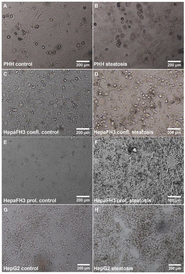 For our studies, HepaFH3 cells were studied in two different states—in the state of proliferation and in the state of confluency when proliferation has ceased and differentiation can occur. In order to study cells within the disease state of steatosis, cells were treated for 24 h with oleic and palmitic acid (2:1 ratio) according to an established protocol [31]. Before steatosis induction, a few small lipid droplets were visible in PHHs, as seen by light microscopy (representative image of all control cells in Figure 1A,C,E,G).