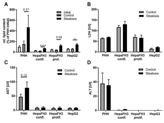 Following steatosis induction, all cell types showed the same capacity to store lipids, with higher lipid content of about 3-fold in the steatotic state compared to the control state in all cell types. The overall lipid content still varied strongly between different cell types, and PHHs still had the highest lipid levels. Significant induction of lipotoxicity as measured by the release of LDH and the transaminases AST and ALT as a result of impaired membrane integrity was not observed. However, slightly higher levels of LDH upon steatosis induction released by PHHs and confluent HepaFH3 cells and for steatotic PHHs for AST could also be detected. Nevertheless, steatosis did not significantly induce cell toxicity (Figure 2B–D). Taken together, our liver models showed comparable capacities for lipid accumulation without manifestation of lipotoxic effects, indicating that these in vitro cellular systems can be used to study the effects of steatosis on metabolism.