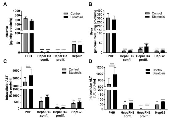 PHHs, but not HepaFH3 cells and HepG2 cells exhibit normal hepatic functions in terms of albumin and urea synthesis as well as intracellular AST and ALT levels. (A) Albumin level and (B) urea level in the cell supernatant between the different cell types with and without steatosis are given. Results were normalized to medium volume, total cellular protein by BCA assay and the period of time. (C) Intracellular AST levels and (D) intracellular ALT levels of the different cell types with and without steatosis are presented. The results were normalized to total cellular protein measured by BCA assay. Data are displayed as mean + SEM from three independent experiments for each cell type. Significant differences (* p < 0.05; ** p < 0.01; *** p < 0.001; **** p < 0.0001) in relation to respective PHH samples are indicated. Significant differences within cell types are indicated by bars. Confl. = confluent, prol. = proliferating.