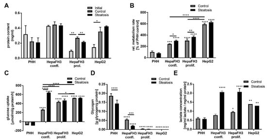 HepG2 and proliferative HepaFH3 cells show potentially increased proliferation, metabolic activity and glucose metabolism compared to PHHs. (A) Protein content as measured by BCA assay in cells 12 h after seeding (initial) and after further 24 h cell culture with (steatosis) or without steatosis (control) is given. (B) Relative metabolic activity measured by MTT assay in cells with and without steatosis is presented. (C) Glucose uptake was measured by determining glucose content of cell medium after 24 h cell culture from cells with and without steatosis. Glucose was measured using a glucose assay and was normalized to the medium volume, the total protein by BCA assay and the period of time. (D) Intracellular glycogen and lactate (E) were measured in cells with or without steatosis and were normalized to total protein content as measured by BCA assay. Data are displayed as mean + SEM from three independent experiments for each cell type. Significant differences (* p < 0.05; ** p < 0.01; *** p < 0.001; **** p < 0.0001) in relation to respective PHH samples are indicated. Significant differences within cell types are indicated by bars. Confl. = confluent, prol. = proliferating.