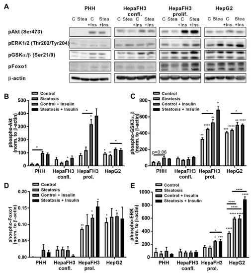 Collectively, HepG2 and proliferating HepaFH3 cells displayed higher levels of P-AKT, P-GSK3α,β and P-Foxo1 compared to PHHs, while P-ERK was only elevated in HepG2 cells, which was even more pronounced in the steatotic state. PHHs and confluent HepaFH3 cells had strong similarities in signaling pathway activation levels in the unstimulated state. However, only PHHs were responsive to insulin stimulus. Besides P-ERK levels in HepG2 cells, steatosis did not significantly affect the analyzed signaling pathways.