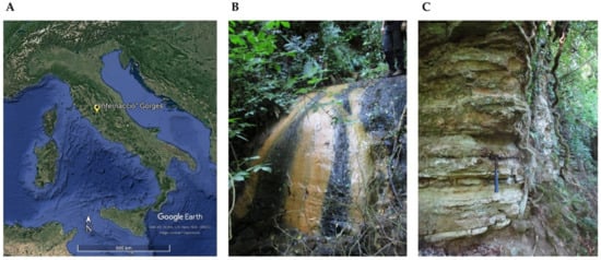 The sampling site at the “Infernaccio” gorge, located in the Viterbo province (Lazio, Italy—42°31′40.85″ N; 12°7′48.24″ E), is part of the “Tuscia” area. Gorges are a unique and distinguishing feature due to their extensive and branching hydrographic network. The activity of three major volcanic complexes (Vulsino, Vicano, and Cimino) formed a pyroclastic layer (lava and ignimbrite deposits). The erosive action of waters resulted in gorges’ deep incisions.