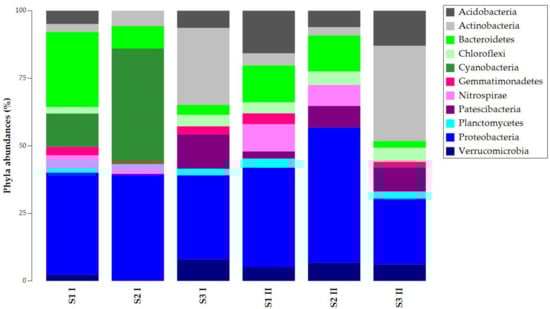 Results were filtered (2% cutoff) and depicted with taxonomy bar plots to study the composition of ASVs at different taxa levels (phylum, family, genus). Figure 2 shows the ASVs abundances at the phylum level. Proteobacteria was common and abundant in all the samples, while Bacteroidetes presented different abundances per sample. The other phyla had different percentages in the total abundances of the samples. Except for sample S2 I, Acidobacteria, Chloroflexi, and Verrucomicrobia were present in all the samples. S1 I and S2 I were the only samples where Cyanobacteria were found, but they lacked Gemmatonomadetes and Patescibacteria. Nitrospirae was absent in S3 samples, while Planctomycetes was absent in S2 samples.
