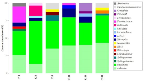 The common presence of Nitrospira in samples S1 and S2 and the exclusive presence of Candidatus Udaeobacter, Nocardioides, and Sphingomonas in sample S3 allowed the separation of the samples into two main clusters (Figure S3). The first cluster was observed for samples S3 I and S3 II, while the second was for all S1 and S2 samples.