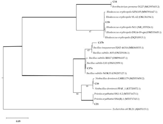 The strains with interesting Mn-oxide-solubilizing abilities were further characterized by 16s barcoding. The phylogenetic analysis associated isolates with Brevibacterium, Bacillus, Neobacillus, and Rhodococcus genera (Figure 5). Isolate C1b was identified as Rhodococcus erytropolis (100% identity). Isolate C14 was identified as Brevibacterium sediminis (100% identity). Isolate C16 was identified as Neobacillus drentensis (100% identity). Isolates C17a and C17b were identified as Bacillus subtilis (100% and 98.7% identity, respectively). Isolate C21 was identified as Priestia aryabhattai (100% identity).