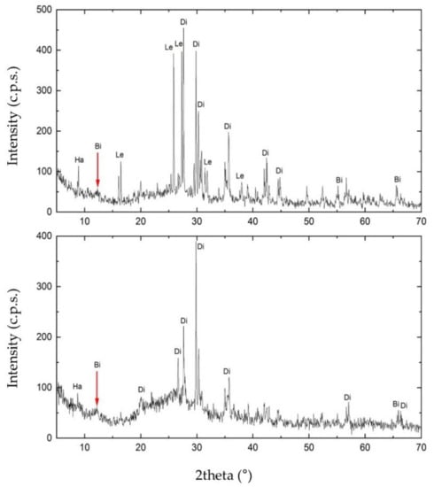 X-ray Powder Diffraction (XRPD) diffractogram obtained for sample S1 (on the top) and S3 (on the bottom). In the figure: Ha, halloysite; Di, diopside; Bi, birnessite; Le, leucite.