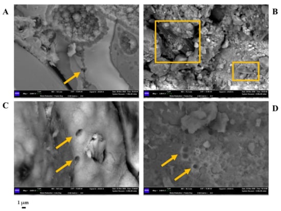 Scanning Electron Microscope (SEM) micrographs obtained for sample S1 (A,B) and S3 (C,D). Microbial imprints are highlighted with arrows. Squares indicate the presence of diatoms. Scale bar (1 µm).