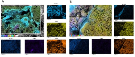 Furthermore, Ca seemed to have a more homogeneous and lower occurrence in S4, while it appeared higher in S1 with the evident presence of some precipitates. Their formation could be attributed to the co-precipitation of calcium carbonate (possibly in the calcite form) during the deposition of Mn oxides. Finally, Fe exhibited a relatively homogeneous distribution in both rock samples.