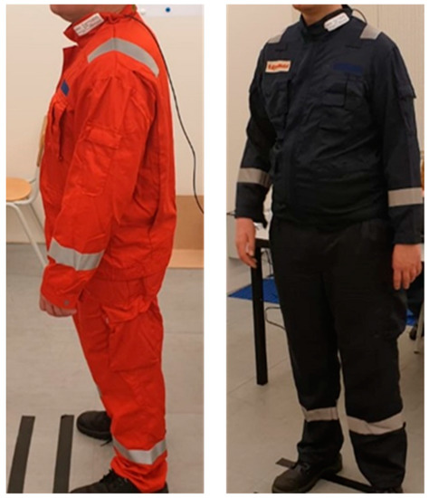 All experiments were carried out with used but clean clothing for process operators from ExxonMobil (Figure 1). The clothing material was Tecashield from TenCate, consisting of 93% Nomex®Comfort, 5% para-aramid, and 2% P140 (quality BV 185, weight 215 g/m2, construction 2/1 twill). The clothing, consisting of a jacket and trousers, was EN ISO 11612 certified [29]. All test persons wore the same clothing during all sessions. The clothing was supplied by ExxonMobil in two versions, namely dark blue and red (Figure 1). Under the operators’ clothing, all test persons only wore their own briefs/boxers (male) or panties and bra (female) and a T-shirt. The sizes of clothing had to be selected from the available ensemble sizes, thus the sizing was not standardized. The participants were provided with as close a proper size of clothing as possible. At the test site, they were provided a wide variety of clothing sizes that they could try on and select the ones that they considered most comfortable. The size of the trousers and jacket could be different and depended on the best fit for the test persons.