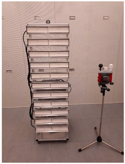 By varying the distance of the test persons from the panel system, different radiation intensities could be achieved. The correct distances were determined in earlier tests with a WBGT measuring instrument (Figure 2; WBGT is a weighted average of the globe temperature, the air temperature, and the natural wet bulb temperature, where the black globe temperature reflects the temperature experienced by people as a result of heat radiation—see ISO 7243 [31]—because the (black) bulb temperature is related to the radiation intensity). Thermal radiation levels were estimated by iterating heat radiation for calculating the black bulb temperature according to Liljegren et al. [32] under the assumption that the black bulb is radiated directly by the panel (cosine of zenith angle = 1 and fraction of direct radiation = 1).