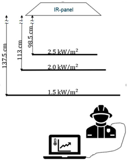 The actual distances can be found in the schematic overview of the measurement setup in Figure 3. To prevent climate differences between conditions other than the imposed intensity of infrared radiation, the experiment took place in a climate chamber set at an ambient temperature of 20 °C and 50% relative humidity. The test persons were equipped with skin temperature sensors (thermistors) connected to an MSR145W logger (range −55 to +125 °C, accuracy within +5 to +45 °C ± 0.1 °C, MSR Electronics, Switzerland) for the continuous registration of skin temperatures at the chest, abdomen, upper arm, thigh, and knee, and wore the process operators’ normal protective clothing including a helmet and sunglasses. Although in practice, radiation can come from all around, for the purpose of this safety study, the choice was made for radiation from the front only, which can be also most realistic during an incident when trying to put out a fire. Therefore, all skin temperature sensors were placed facing the front.