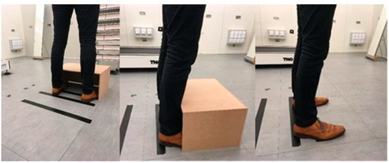 Subsequently, after entering the climate chamber, the MSR data logger was connected to a laptop with a cable allowing the real-time monitoring of the skin temperature. The test person was then instructed to make shin contact (Figure 4) with an inverted U-shaped wooden box that was precisely aligned at a specified distance depending on the exposure condition, while the test person stood upright in front of the radiation panel. Subsequently, the box was removed, and the test persons had to make stepping movements while the toes were not allowed to leave the ground to fix the test persons in the right spot. Then, the reflective screen between the test person and the working radiation panel was removed so that the specified heat was instantly applied to the test person. The exposure time was set to a maximum of five minutes. The criteria for stopping earlier were: a skin temperature at one of the measured locations above 43 °C or a request from the test person that it is no longer acceptable to stay in front of the radiation panel, for example, due to pain. During the last 30 s of a session, or immediately after the termination of the test (if skin temperature at any measured spot reached 43 °C or the test person requested to stop) the participants were asked again for their thermal, comfort, and pain sensations, and perceived exertion.