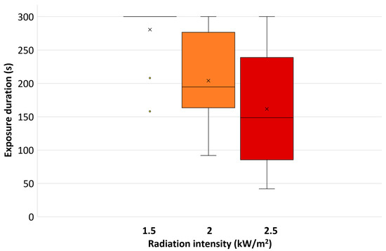 The median and mean exposure times with the standard deviation and the outliers at the different radiation intensities are shown in Figure 5. The median values for the exposure time for the radiation intensities of 1.5, 2.0, and 2.5 kW/m2 were 300, 195, and 149 s, respectively. Due to two test persons who did not reach the maximum exposure time at 1.5 kW/m2, the average exposure time was slightly lower than 5 min, while the median for this radiation intensity was 5 min. The exposure time at 1.5 kW/m2 was significantly higher than that for 2.0 and 2.5 kW/m2 (p < 0.005 and p < 0.0005, respectively), while the latter two did not differ significantly from each other (p > 0.2).