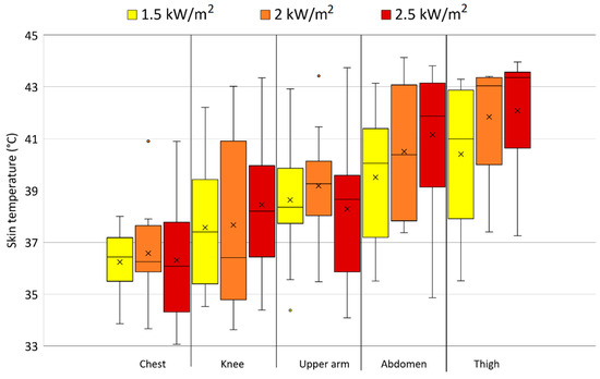 The median and mean highest achieved skin temperatures with the standard deviation and the outliers at the various skin locations across the test persons are shown for each radiation intensity in Figure 6. On average, the skin temperatures for all exposure levels remained below the critical value of 43 °C, but individually, with the exception of chest temperature, temperatures of 43 °C or higher were measured. It has to be considered that the experiments were stopped when the temperatures reached 43 °C, and much higher values were not possible, except for some after-rise related to the thermal inertia of the clothing system [35]. The highest skin temperature measured in this study was 44.1 °C.