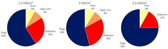 Figure 7 shows the ratio of skin locations with maximum skin temperatures. As can be seen, the most affected areas under all radiation intensities were the thighs and abdomen, and this can be directly related to the minimal air gap—or reduced air gap due to the stepping motions—between the textile and the skin. Although the test persons were set in a fixed position, the most protruding body parts with minimal ventilation and air gap were the abdomen and thighs. This could be another reason for the highest temperatures at these locations. At the chest, the highest temperature was never measured. This could be explained by the fact that the chest sensor might have been covered by multiple textile layers of the chest pockets.