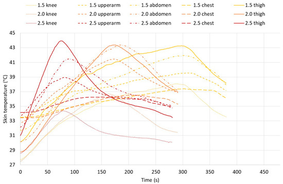 Figure 8 shows the typical temperature trends at the different skin locations over time of a test person (TP6). The graph shows that this test person was exposed for the full 5 min at 1.5 kW/m2. This test person had to stop earlier at 2 and 2.5 kW/m2 due to reaching a skin temperature of 43 °C (thigh). The individual curves for different test persons could differ, while the general trend followed the temperature change pattern seen in this participant.