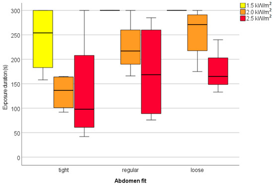 The air gap at the abdomen showed a significant effect on the exposure duration at 2.0 kW/m2. The variable air gap at the abdomen showed the largest variance compared to the other measured air gap locations within the clothing fit groups. The participants were asked to make stepping movements during exposure that could cause a pumping effect of the air gap at the thigh. The arms were moving slightly, due to the stepping movement. Therefore, the pumping effect could also be slightly present at the upper arm and even in the upper body. The air gap at the abdomen seemed to be the most stable air gap, with enough variance in air gap over all participants, which could explain the significant findings for the effect of air gap on exposure duration at the radiation intensity of 2.0 kW/m2. The lower (1.5 kW/m2) and higher (2.5 kW/m2) radiation intensities did not show air gap effects on exposure duration. At the lowest radiation intensity this could be explained by the clipping effect (exposure length was maximally 5 min). At the highest radiation intensity, the exposure times were relatively short. At this radiation intensity, the process operators’ clothing did not seem very suitable. This could be related to the air gap thickness, but also the fabric thickness or the backside emissivity that can have a large influence on the thermal protective clothing, which could be too low to protect against this level of the highest used radiation intensity [15].