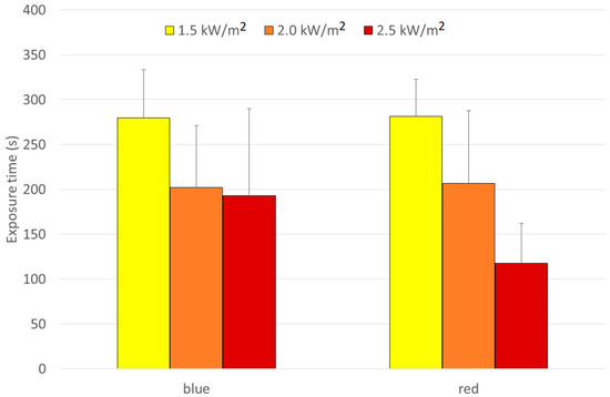 There were no observations of any significant differences caused by color at 1.5 and 2.0 kW/m2, while at 2.5 kW/m2, the exposure time in blue protective gear was significantly longer than in the red one (Figure 10). The ∆Tskin/t pattern confirmed this result.