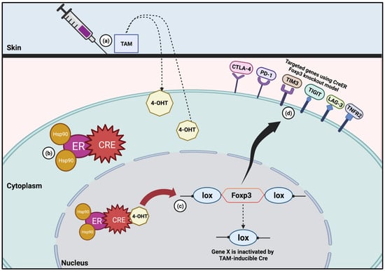 TAM-inducible CreER system in Foxp3 knockout model. (a) Once TAM is administered, it is metabolized into 4-hydroxytamoxifen (4-OHT). (b) Without TAM, CreER will result in the shuttling of the mutated recombinase into the cytoplasm. The protein will stay in this location in its inactivated state until TAM is given. (c) 4-OHT then binds to the ER and results in the translocation of the CreER into the nucleus, where it is then able to cleave the lox sites. (d) Foxp3 knockout model has been used to study specific immune checkpoints such as CTLA-4, PD-1, TIM3, TIGIT, LAG-3 and TNFR2.