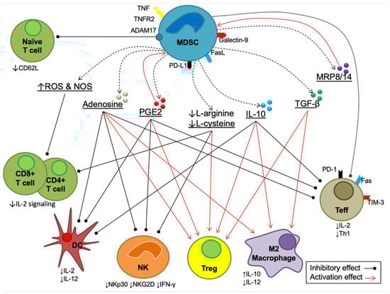 MDSC-mediated immunosuppression occurs by various pathways, including (1) direct interactions between MDSCs and T cells, (2) production of inhibitory cytokines, prostaglandin E2 (PGE2), adenosine, myeloid-related proteins (MRP8/14) and free radicals, both reactive oxygen species (ROS) and reactive nitrogen species (NOS), (3) degradation of essential amino acids (arginine and cysteine) and (4) the indirect inhibitory effect of ADAM metallopeptidase domain 17 (ADAM17) [95,96,97]. The overall mechanisms of these four pathways are summarized in Figure 2.