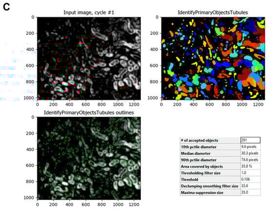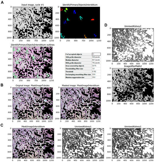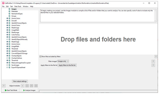 CellProfiler™ is a program designed for and by biologists to measure cells and analyze data obtained from biological samples [5,6]. Some of its best features are modularity, ease of use, and the ability to automatically process hundreds or even millions of images using pipelines that can be exported to databases and used by everyone [7]. The software (Stable version 3.1.9) can be installed on Windows® and Mac® computers and is available at www.cellprofiler.org (accessed on 7 July 2022). Pipelines are small programs created in the graphical user interface (GUI) of CellProfiler™ that are easy to create, save, and share [6]. They sequentially use modules for specialized image analysis with processing such as object form identification, color balance and extraction, object measurement, area quantification, and data exporting. This study aimed to provide a tool for the simultaneous and automatic analysis of multiple photomicrographs of kidneys from different murine models of CKD stained with Masson’s trichrome stain for the rapid quantification of fibrosis. The pipeline made and described here can be downloaded from the official program website (in About/Published Pipelines) or from the Supplementary Material and be used freely.
