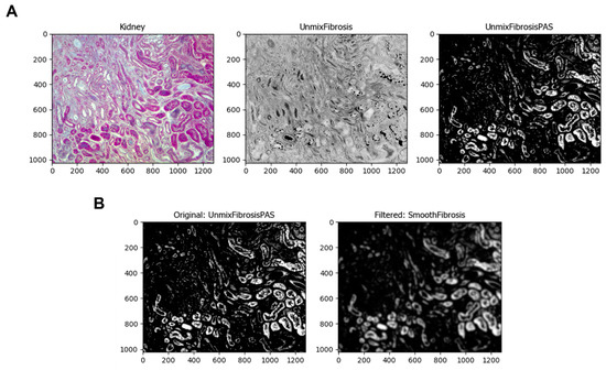 Even though this pipeline measures the fibrotic tissue area in stained slides only in those areas of tubulointerstitial fibrosis, it does not distinguish normal fibrotic tissue (connective tissue of basement membranes) from pathological fibrotic tissue. In this sense, workarounds can be made to overcome this limitation and challenge, such as subtracting the fibrotic area calculated previously from a control sample or combining Masson’s Trichrome with PAS staining. This method is made by deriving a differential staining area by subtraction morphometry [15,29] and using this pipeline on that derived image. Alternatively, polarized Sirius Red staining (specific for collagen types I and III) can be used.