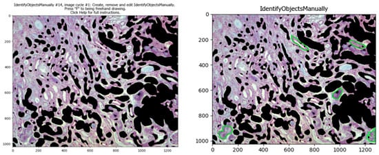 Manual identification of objects. The IdentifyObjectsManually module, if enabled, lets the user select objects or areas in the image (manually selected areas are in green after the freehand drawing).