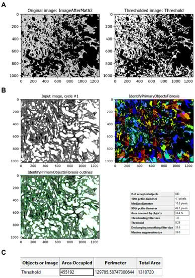The Threshold module is then used to obtain an image that can be processed to identify the fibrotic areas (Figure 7A). This module calculates the threshold value of the unmasked pixels of the image. The value obtained is used to classify pixels above and below; the pixels above are treated as foreground, and the pixels below are treated as background. This value can be calculated automatically or can be adjusted by a correction factor to apply another method or strategy option to adapt more precisely across all images. The resulting process creates a binary image that shows the fibrotic area in white (1) and the background in black (0). With the resulting image, the fibrotic areas can be identified using the IdentifyPrimaryObjects module (Figure 7B). Once the image is thresholded, the program can measure the fibrotic area using the MeasureImageAreaOccupied module (Figure 7C).