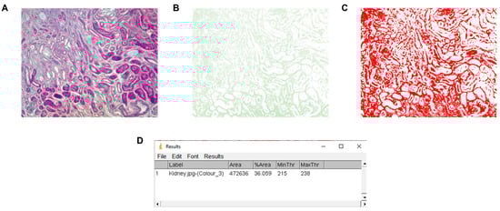 Fibrotic area calculation using ImageJ. (A) Original image, (B) green channel, (C) thresholded, and (D) measured fibrosis area and percentage with the minimum and maximum threshold values.