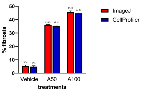 Fibrotic area measurement between ImageJ and CellProfiler™ with different treatments. No significant statistical differences were found between the programs. Mean ± SD (n = 5). Vehicle: 75% glycerin; A50: adenine (50 mg/kg); and A100: adenine (100 mg/kg).