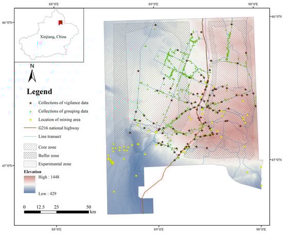 This study was conducted in the KNR (44°36′–46°00′ N, 88°30′–90°03′ E), located in the eastern part of the Junggar Basin, Xinjiang, China (Figure 1). The elevation of the KNR is between 600 and 1700 m above sea level. This region has a harsh continental climate with an average yearly temperature of +1.99 °C. Winters are cold and long; summers are hot and short. The average annual rainfall is around 186.8 mm. Vegetation cover is quite sparse and consists mostly of desert and dwarf shrubs from the families Chenopodiaceae, Ephedraceae, Tamaricaceae, and Zygophyllaceae. The most common desert tree is the saxaul (Haloxylon ammodendron). Common shrubs are Anabasis salsa, Atraphaxis frutescens, Calligonum mongolicum, Ceratocarpus arenarius, and Ceratoides latens. Around 6628–19,677 goitered gazelle live in the KNR []. The natural predation risk is considered very low, since wolves, the main predators of goitered gazelle, exist in very low numbers.