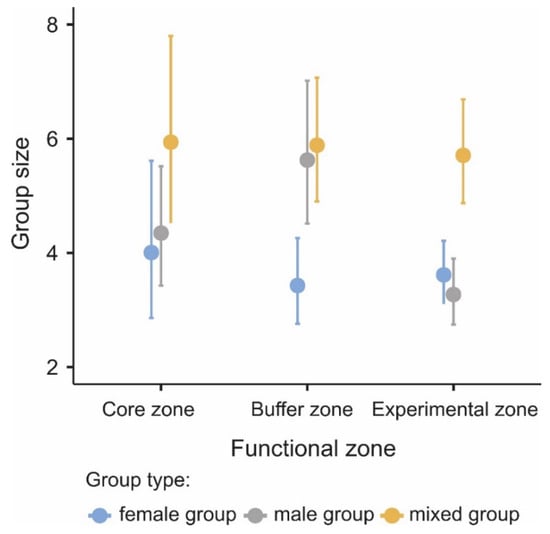 To test our predictions, a general linear mixed model (GLMM) with a negative binomial distribution was used to analyze the effects of functional zone, group type, and its interaction on group sizes. The date of observation was included as a random factor to further control for any potential pseudo-replication resulting from multiple observations of the same individuals over time.