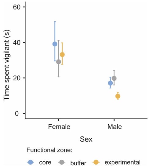 Influence of sex of goitered gazelle on the time spent vigilant (in seconds) in the core (blue dots), buffer (gray dots), and experimental zones (yellow dots). The values represent the estimated means from the general linear mixed model, and the bars represent the 95% confidence intervals.