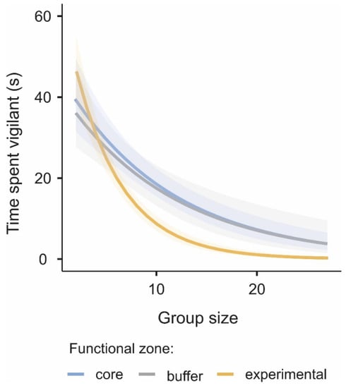Regarding vigilance, a GLMM with a negative binomial distribution was used to evaluate the potential effect of functional zone, group size, and sex (and their interactions) on the number of seconds spent vigilant. Group ID was included as a random factor.